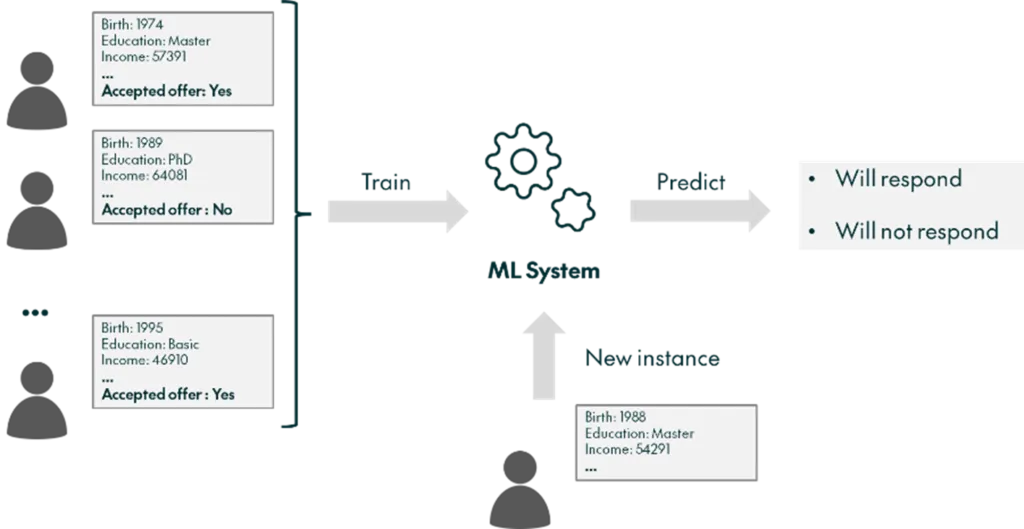 Our goal, then, is to develop an ML model capable of predicting who will respond to the offer based on personal information, which effectively means getting to know the people interested in the company’s products. This can be very useful, for example, in a “flash offer” scenario, where every day a subsample of customers is selected for the presentation of a special limited-time offer, with the model helping to choose the subsample. Figure 2 gives us a simplified visualisation of this goal: