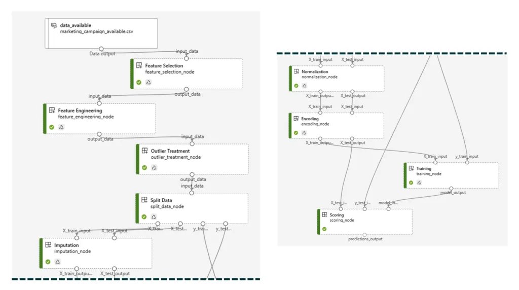 To define the Azure ML pipeline (different from the main DevOps pipeline), a separate Python file is used, which consists of importing the individual files (corresponding to the components) and connecting inputs to outputs. In this file, the data source is specified, the pipeline is submitted, and the components are registered, so a new version is created every time they change. Figure 7 shows what the pipeline looks like inside the Azure Machine Learning Studio once everything has been set up: