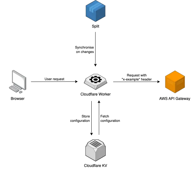 The diagram below describes the overall system design using Split as the feature management tool, Cloudflare Worker as an edge server, and AWS API Gateway as the origin server.